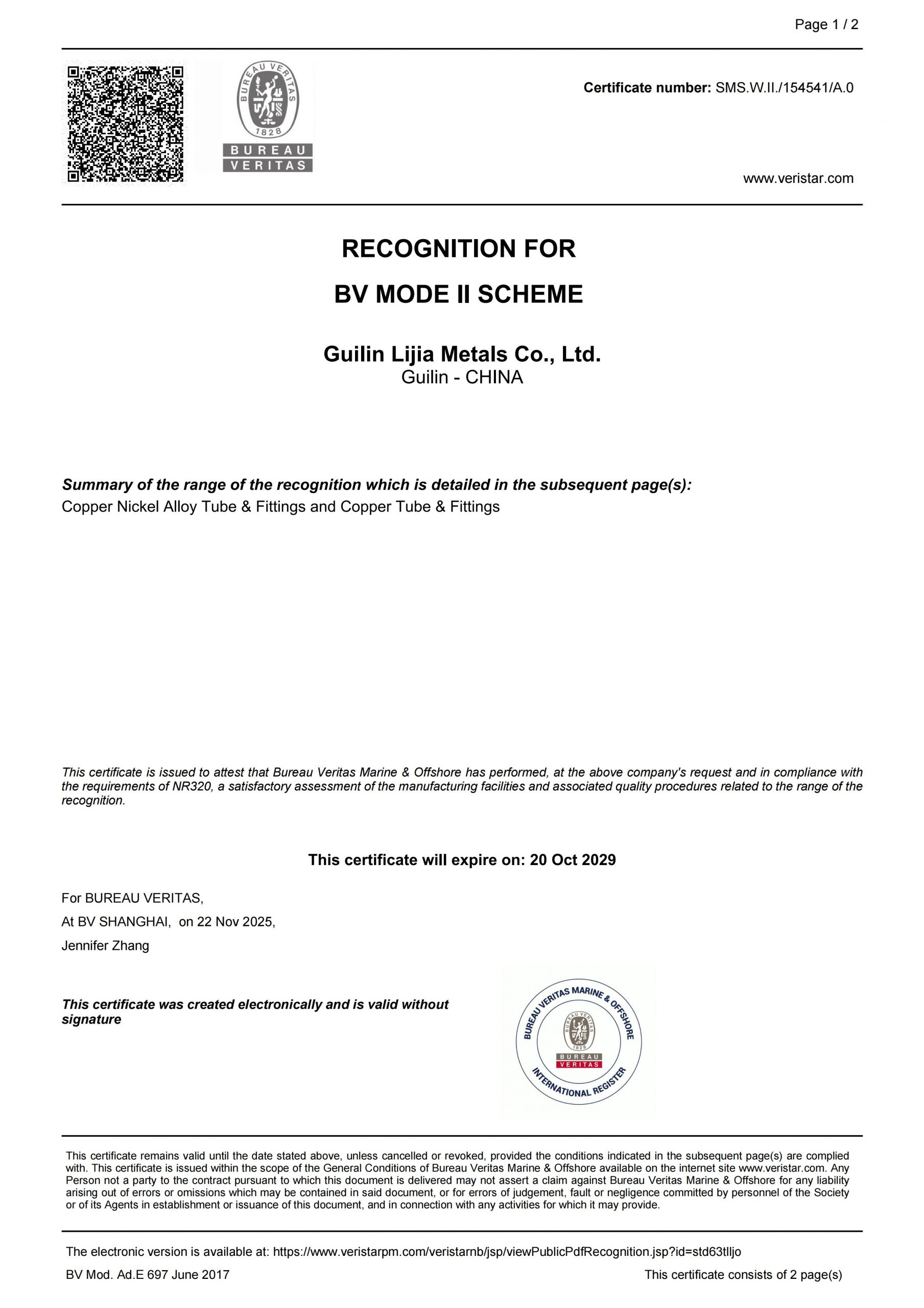深耕铜加工行业近50年,桂林漓佳公司构建了覆盖全球主流标准的“认证矩阵”:除此次新增的BV船级社认证外,还先后通过ISO9001质量管理体系认证、ISO14001环境管理体系认证、ISO45001职业健康安全管理体系认证,及多国行业专项资质认证,形成了“国际标准+行业规范+公司内控”三位一体的合规保障体系。依托这一完善体系,桂林漓佳公司能够精准匹配不同国家和地区的技术法规要求,为全球客户提供“量身定制”的合规解决方案——从产品设计阶段的标准适配,到生产过程的合规管控,再到交付后的资质支持,实现全周期、全方位的合规产品保障。